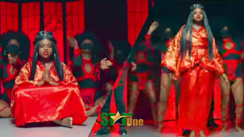 Le choix des images présente une scène captivante du vidéoclip. Au centre, JeeJee se distingue par sa robe rouge éclatante, symbolisant à la fois la puissance et la féminité. Son expression concentrée et sa posture en prière créent une aura mystique, presque rituelle.