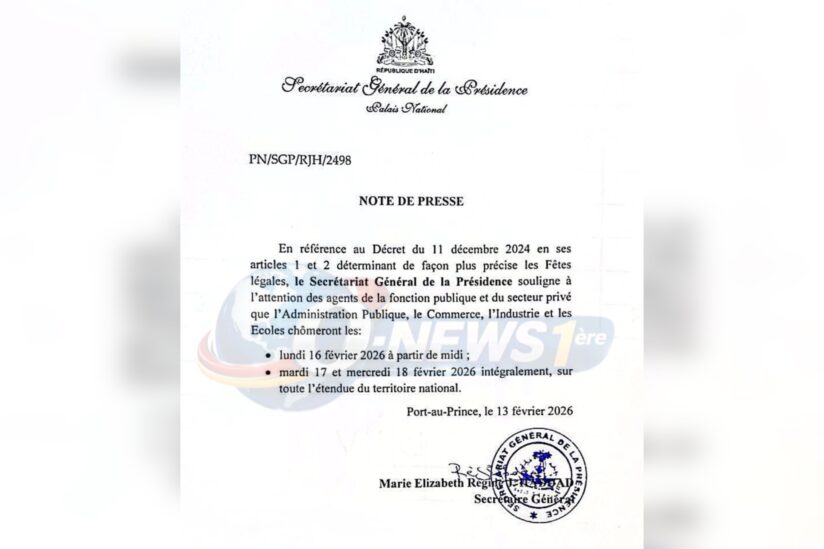 Dans une note de presse publiée 13 février depuis le Palais national, le Secrétariat général de la Présidence rappelle les dispositions du décret du 11 décembre 2024 encadrant les fêtes légales. Ce rappel vise à assurer une application uniforme des jours fériés par les agents de la fonction publique comme par les acteurs du secteur privé.